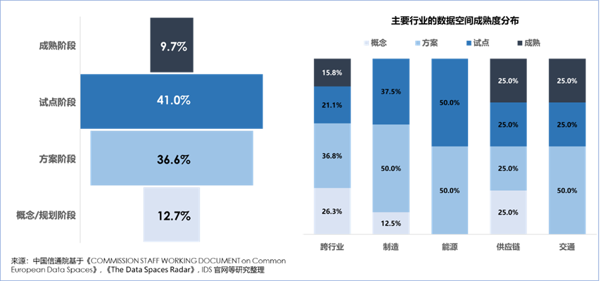 歐盟將數據空間應用成熟度分為四級,目前項目多處于方案和試點階段,尚未進入成熟期。從行業分布上,交通、供應鏈、跨行業的數據空間相對進展較快,制造和能源行業也已經儲備一批進入方案和試點階段的項目。
