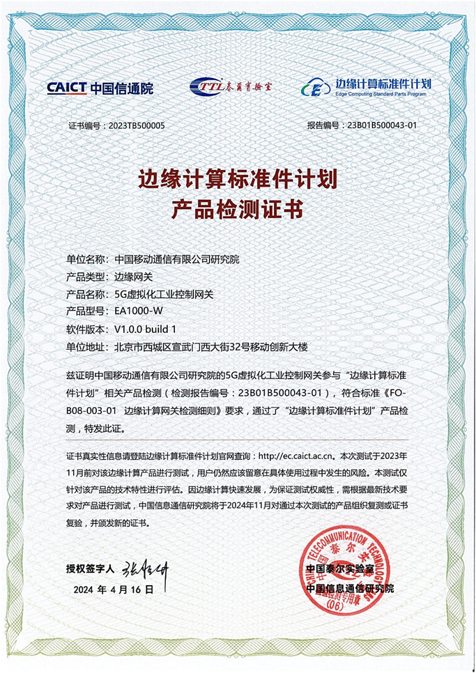 中國移動研究院自主研發的5G虛擬化工業控制網關順利通過本次“邊緣計算標準件計劃”產品測試,并且在多個領域實際應用部署和持續穩定運行,助力各行業企業應用升級,推動數字化建設落地。
