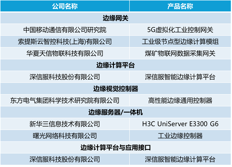 本次測試涵蓋多層次全品類邊緣計算產品,包括邊緣控制器、邊緣網關、邊緣服務器/一體機等,共有來自中國移動通信有限公司研究院、深信服科技股份有限公司、東方電氣集團科學技術研究院有限公司、新華三信息技術有限公司、索提斯云智控科技(上海)有限公司、曙光網絡科技有限公司、華夏天信物聯科技有限公司等企業的10款產品通過測試,具體名單如下。