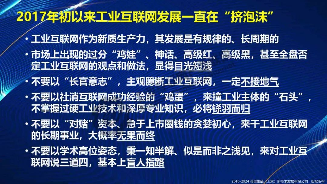 中國工業(yè)互聯(lián)網(wǎng)兼容繼承了兩化融合、企業(yè)信息化、工業(yè)自動化、智能制造、CIMS、IPD、數(shù)字化轉(zhuǎn)型、新型工業(yè)化等多模式活動,以可持續(xù)融合創(chuàng)新方式,支撐、優(yōu)化、賦能企業(yè)發(fā)展,對推動制造業(yè)轉(zhuǎn)型升級、提升生產(chǎn)效率、降低運營成本等方面具有重要意義。在過去多年發(fā)展中工業(yè)互聯(lián)網(wǎng)已經(jīng)擠出很多泡沫,即將迎來高質(zhì)量發(fā)展新時期。