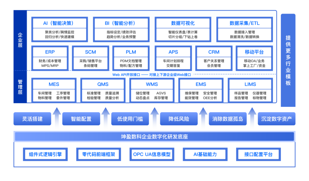 企業(yè)數(shù)字化研發(fā)底座以信息模型概念為基礎(chǔ),搭載坤盈數(shù)科自主研發(fā)的“組件式邏輯引擎”和“零代碼前端框架”等技術(shù)集,面向企業(yè)數(shù)字化研發(fā)過程中面臨的功能研發(fā)、部署、迭代、多系統(tǒng)集成、企業(yè)數(shù)據(jù)挖掘、AI賦能等課題給出了一系列研發(fā)工具。坤盈數(shù)科的宗旨是“只需要一個(gè)平臺(tái),就可以解決企業(yè)數(shù)字化建設(shè)的所有問題。通過使用企業(yè)數(shù)字化研發(fā)底座,企業(yè)能夠由非IT技術(shù)人員完成數(shù)字化應(yīng)用的搭建,并真正的實(shí)現(xiàn)“敏捷研發(fā)”,縮短從需求到功能落地之間的步驟,降低數(shù)字化項(xiàng)目風(fēng)險(xiǎn),大大縮減項(xiàng)目研發(fā)成本和周期,使企業(yè)數(shù)字化的落地實(shí)施更加平滑。