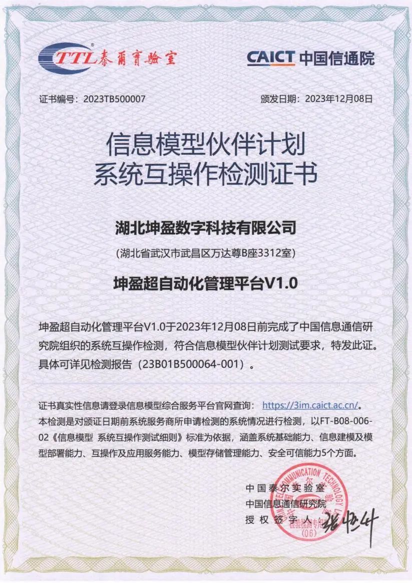 湖北坤盈數(shù)字科技有限公司(以下簡(jiǎn)稱“坤盈數(shù)科”)是工業(yè)互聯(lián)網(wǎng)產(chǎn)業(yè)聯(lián)盟信息模型伙伴計(jì)劃伙伴單位,自主研發(fā)的坤盈超自動(dòng)化管理平臺(tái)V1.0是基于坤盈數(shù)科企業(yè)數(shù)字化研發(fā)底座衍生出的綜合管理平臺(tái),該平臺(tái)完成了中國(guó)信息通信研究院組織的系統(tǒng)互操作檢測(cè)。