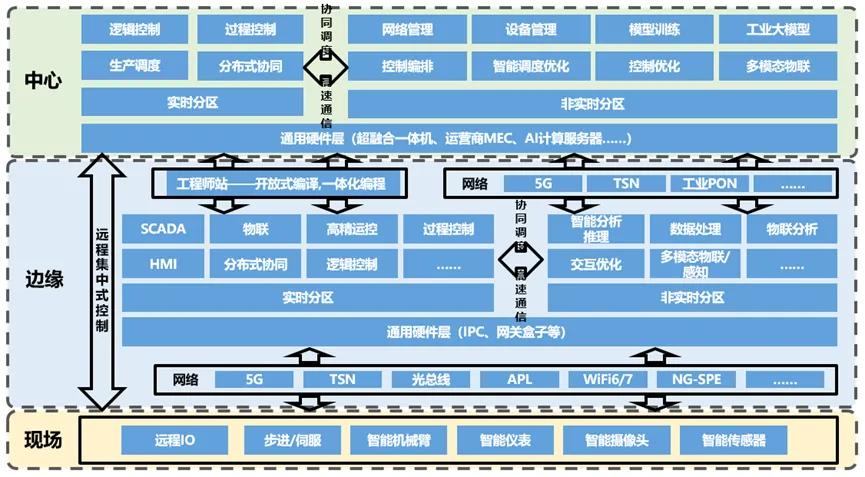 隨著ICT技術在工業領域的深度融合與廣泛應用,傳統工廠ISA-95生產體系架構正經歷著前所未有的深刻變革。隨著智能機器的發展和智能分析的集中,工業生產體系架構進一步扁平化,通過功能疊加和收編改造,傳統的垂直體系將會變成水平架構,從傳統的ISA95的五層金字塔架構演變成為“以控制+計算+網絡為中心”的云-邊-端三層體系架構。L3和L4層的企業生產和管理系統如ERP、MES等,正逐步從傳統的單機系統架構向云化架構轉型,不僅實現了ERP、MES等關鍵應用的中心云端部署,更依托AI大模型與數據治理技術的強大支撐,催生出統一管理和運維的工業互聯網云平臺。同時L2(監測層)系統也展現出新的發展趨勢,部分功能融合數字孿生、人工智能等技術,部署至中心云端,實現生產過程的直觀呈現與深度洞察;另一部分則向邊緣側延伸,融合物聯、邊緣智能推理等能力,強化數據采集、分析推理等核心能力,逐漸以虛擬化、分布式部署于邊緣側。L1(控制層)功能同時也逐漸向邊側遷移,隨著軟硬件解耦合逐步發展及智能化邊緣控制成為主流方向,控制資源池化并靈活部署于通用計算架構之上。這一變革不僅提升了系統的靈活性與可擴展性,更在多個工業場景中展現出現場應用價值。L0(工業裝備層)裝備的數字化與終端的智能化進程加速推進,向終端側遷移,形成智能終端。多模態傳感器、智能儀表、智能裝備、具身機器人等關鍵技術的研發取得顯著進展,使得數據收集、處理與存儲的門檻顯著降低。同時,小型化、輕量級的實時操作系統與IP協議棧應運而生,以極低的資源占用率與能耗,實現了對工業終端的高效管理與控制,為工業互聯網的廣泛部署奠定了堅實基礎。