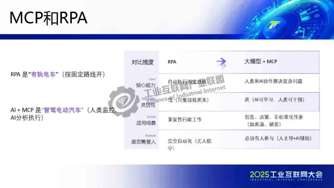 賀松介紹,基于MCP協(xié)議的AI落地解決方案,解決企業(yè)數(shù)字化轉(zhuǎn)型兩大痛點(diǎn):1)業(yè)務(wù)語(yǔ)境缺失——通過(guò)標(biāo)準(zhǔn)化接口注入訂單狀態(tài)、客戶(hù)信息等上下文,使大模型精準(zhǔn)理解業(yè)務(wù)語(yǔ)義;2)數(shù)據(jù)孤島問(wèn)題——MCPFlow平臺(tái)集成ERP、CRM等系統(tǒng)工具鏈,實(shí)現(xiàn)"搭積木式"AI服務(wù)調(diào)用,將開(kāi)發(fā)周期縮短70%。結(jié)合中國(guó)信通院"星火鏈網(wǎng)"構(gòu)建可信AI智能體交換中心(ASP),確保內(nèi)外數(shù)據(jù)安全互通。該方案推動(dòng)大模型從概念走向業(yè)務(wù)控制,實(shí)現(xiàn)人機(jī)協(xié)同決策,形成開(kāi)放AI生態(tài)