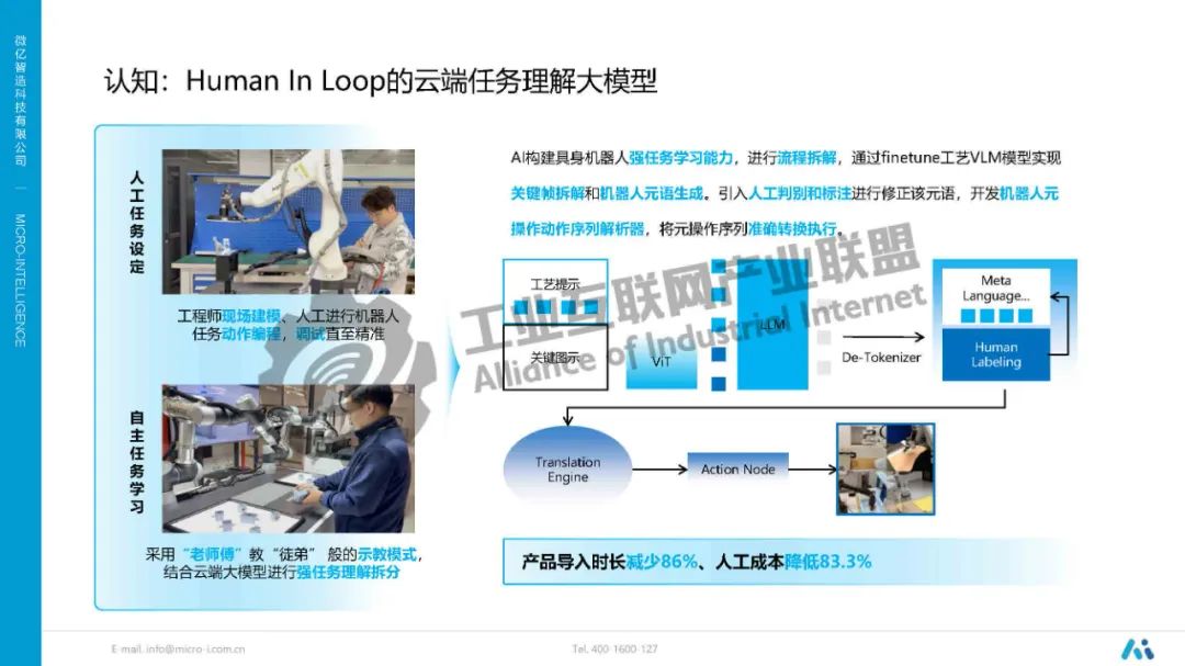 AI構(gòu)建具身機(jī)器人強(qiáng)任務(wù)學(xué)習(xí)能力,進(jìn)行流程拆解,通過finetune工藝VLM模型實(shí)現(xiàn)關(guān)鍵幀拆解和機(jī)器人元語生成。引入人工判別和標(biāo)注進(jìn)行修正該元語,開發(fā)機(jī)器人元操作動(dòng)作序列解析器,將元操作序列準(zhǔn)確轉(zhuǎn)換執(zhí)行。