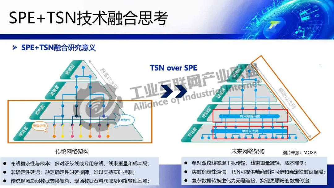 李慶介紹,TSN 提供確定性低時延通信保障,為各類系統建立統一的工業骨干網絡。SPE將以太網覆蓋范圍擴展至現場層,實現設備全連接,構建起真正統一的工業網絡。SPE+TSN的融合可降低布線成本、簡化設備聯網架構,為未來各行業智能化、實時化通信提供新的技術路徑。