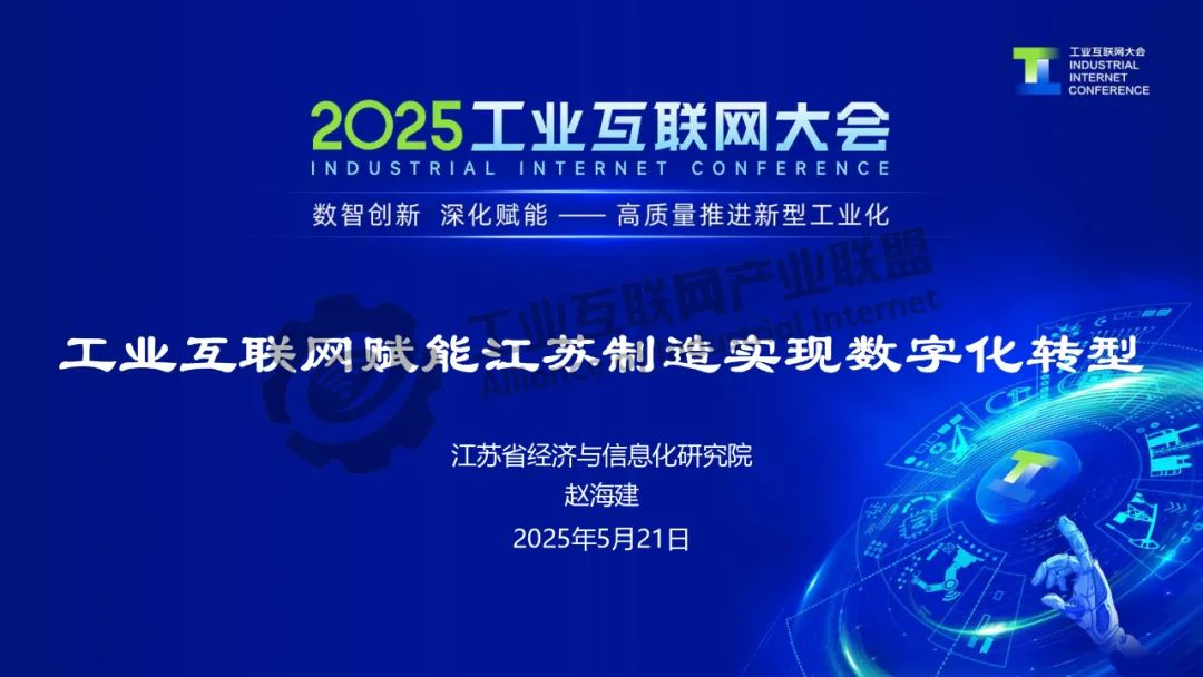5月21日,在2025工業互聯網大會“工業互聯網產融合作專題活動”上,江蘇省經濟和信息化研究院副院長趙海建發表了《工業互聯網賦能江蘇制造業實現數字化轉型》的主題演講。