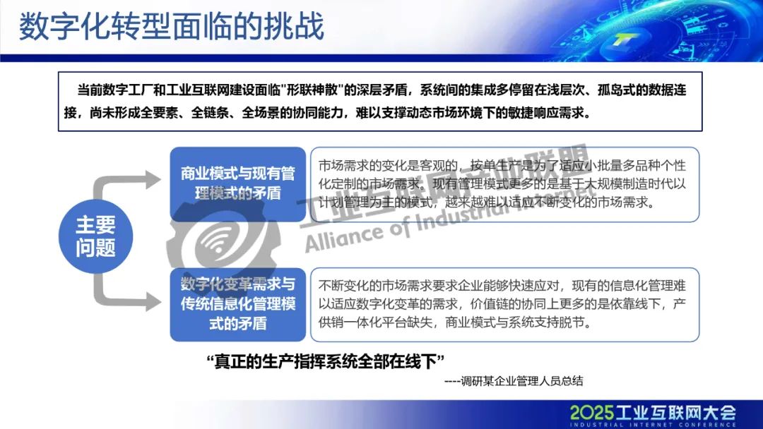 趙海建介紹,當前數字工廠和工業互聯網建設面臨"形聯神散"的深層矛盾,系統間的集成多停留在淺層次、孤島式的數據連接,尚未形成全要素、全鏈條、全場景的協同能力,難以支撐動態市場環境下的敏捷響應需求。依托工業大數據分析平臺建設和人工智能算法應用,在質量管控、能效優化、設備管理以及基于畫像的精準營銷服務方面進行全方位探索和應用,深度挖掘數據資產價值,形成工業機理模型,支撐數據驅動的智能化轉型升級。