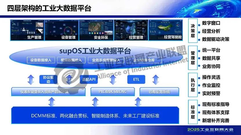 基于supOS的四層架構(gòu)工業(yè)大數(shù)據(jù)平臺,旨在實現(xiàn)企業(yè)全鏈路數(shù)據(jù)整合與智能化管理。平臺通過設備數(shù)據(jù)、視頻數(shù)據(jù)和業(yè)務系統(tǒng)數(shù)據(jù)的多源接入,構(gòu)建企業(yè)級數(shù)據(jù)倉庫,并依托協(xié)議驅(qū)動、API適配和ETL工具實現(xiàn)高效數(shù)據(jù)流轉(zhuǎn)。