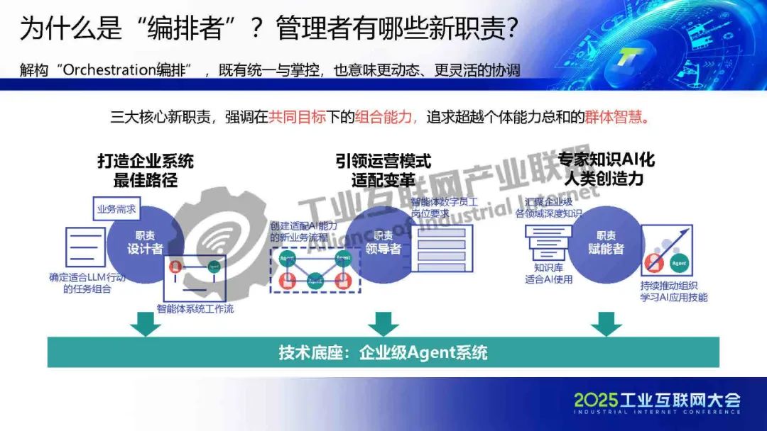 程莉介紹,AI Agent(智能體)可以在人類控制下進行自主行動或人機協同執(zhí)行任務,人類作為AI的“編排者”,既有統(tǒng)一目標的掌控力,也意味著動態(tài)靈活的協調力。其三大核心職責是: