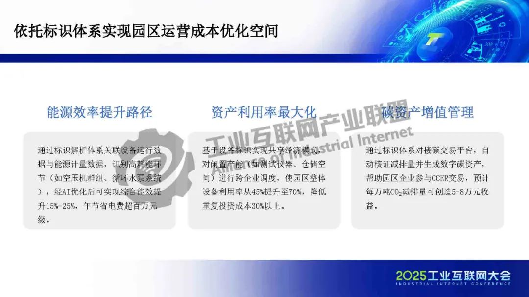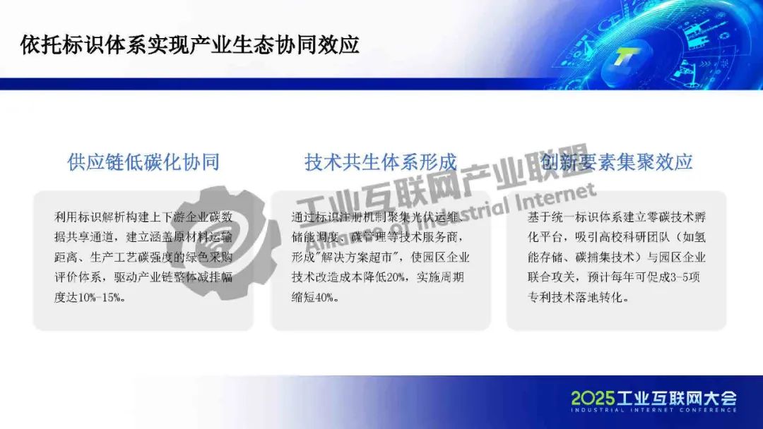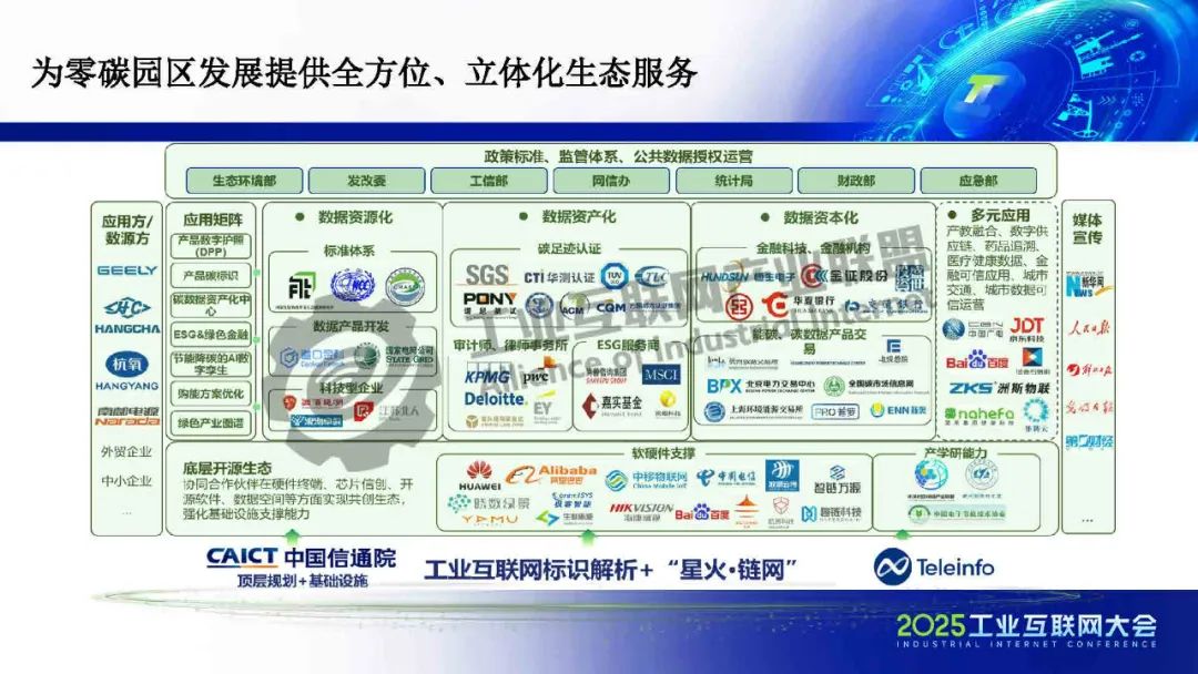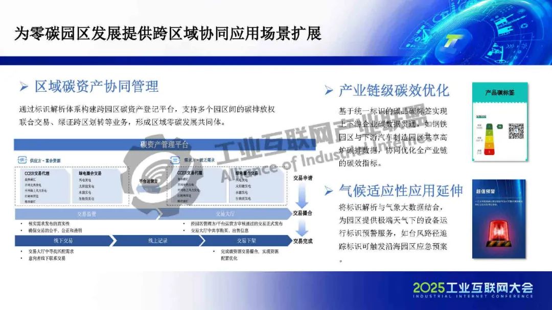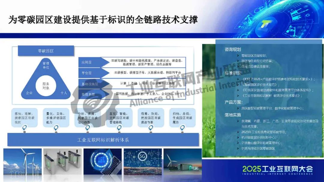 在園區建設方面,標識體系作為工信部推動全行業互聯互通的核心基礎設施,承擔著打破行業壁壘、賦能企業數字化升級的重要使命。一方面,依托標識體系,可以為企業、產品和設備賦予統一、可信的數字身份,實現數據的精準溯源與全流程管理,為能源效率提升和碳資產增值管理提供有力支撐,從而釋放園區運營成本優化空間。另一方面,標識體系有助于打通企業內部及產業鏈上下游的信息壁壘,破解數據孤島,進一步提升供應鏈的低碳協同效率。