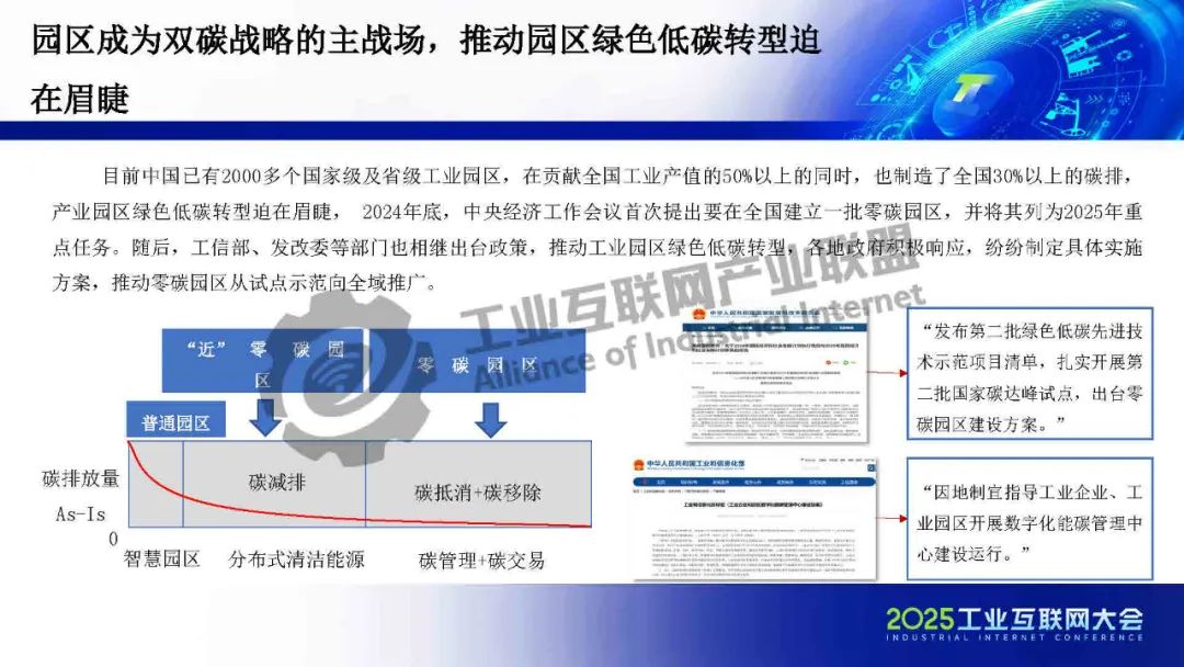 曾西平表示,綠色低碳發展已成為全球共識,工業園區是實現國家“3060”雙碳目標的關鍵陣地。目前我國擁有2000多個國家級和省級工業園區,這些園區貢獻了全國50%以上的工業產值,碳排放總量占全國的30%以上,是推動“雙碳”戰略目標落地的主力軍。2024年底,中央經濟工作會議首次將零碳園區建設列為2025年重點任務,隨后多部委密集出臺政策,全面加快工業園區綠色低碳轉型步伐。