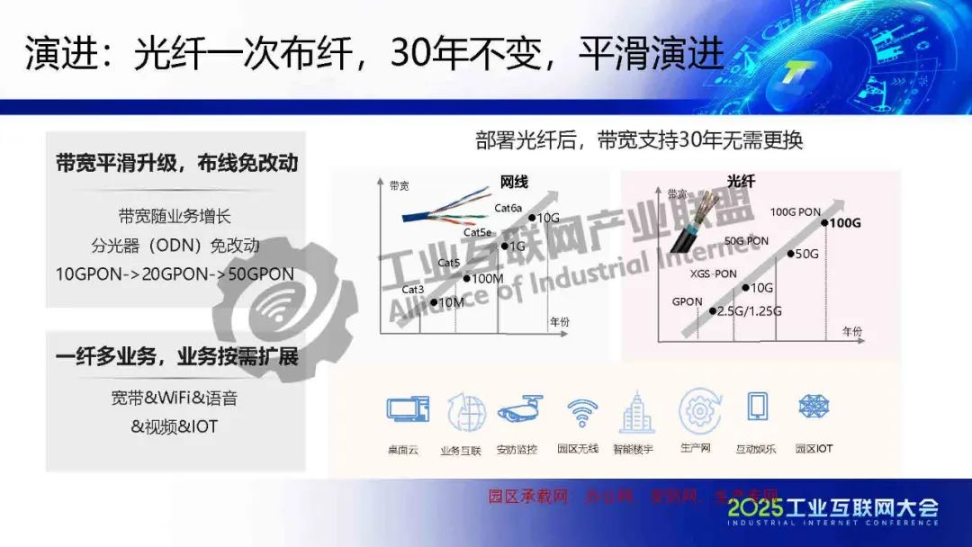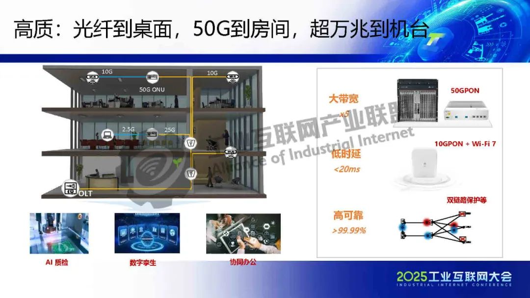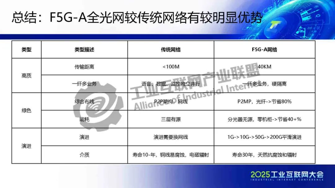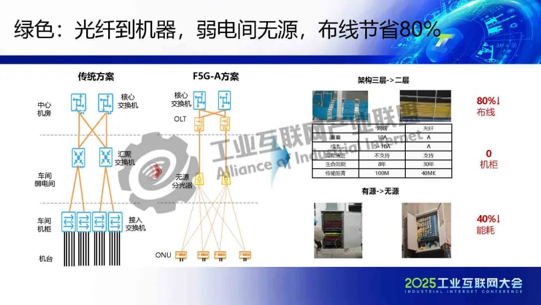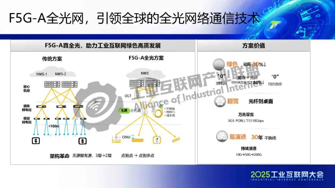 F5G-A全光網(wǎng)通過架構(gòu)革新和全光化升級(jí),為工業(yè)互聯(lián)網(wǎng)提供綠色高效的通信解決方案。相比傳統(tǒng)方案,F(xiàn)5G-A采用統(tǒng)一網(wǎng)管和光線路終端,實(shí)現(xiàn)三大核心優(yōu)勢(shì):一是綠色節(jié)能,能耗降低30%,以光纖替代銅線實(shí)現(xiàn)零電磁干擾,減少80%弱電間建設(shè)和維護(hù)成本。二是超寬性能,支持光纖到桌面的10Gbps對(duì)稱帶寬。三是長(zhǎng)期兼容,線路30年無需更換并可平滑升級(jí)至200G速率。通過將網(wǎng)絡(luò)架構(gòu)從3層簡(jiǎn)化為2層、拓?fù)鋸狞c(diǎn)到點(diǎn)優(yōu)化為點(diǎn)到多點(diǎn),F(xiàn)5G-A在降低復(fù)雜度的同時(shí)提升了傳輸效率,為工業(yè)數(shù)字化轉(zhuǎn)型提供了高帶寬、低時(shí)延、可持續(xù)的新一代網(wǎng)絡(luò)基礎(chǔ)設(shè)施。