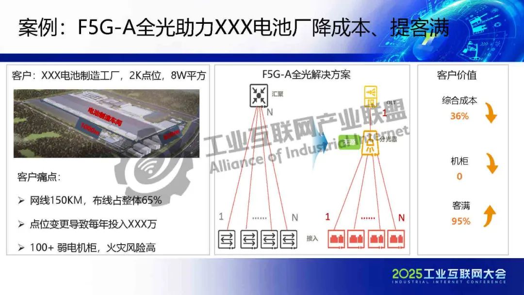 龔奎介紹,在工業(yè)園區(qū)網(wǎng)絡(luò)建設(shè)中,光進(jìn)銅退是大趨勢(shì),F(xiàn)5G-A全光園區(qū)方案因光纖介質(zhì)易獲取、無源傳輸?shù)葍?yōu)勢(shì),可實(shí)現(xiàn)綠色節(jié)能,且能更好滿足AI應(yīng)用對(duì)大帶寬、低時(shí)延的要求。國(guó)家政策也支持PON技術(shù)在園區(qū)應(yīng)用。華為的F5G-A園區(qū)網(wǎng)絡(luò)解決方案,具有綠色、高質(zhì)、易演進(jìn)特點(diǎn),采用光纖到機(jī)器、無源分光器等技術(shù),可節(jié)省部件成本80%以上,減少弱電機(jī)柜需求,還具備長(zhǎng)生命周期、強(qiáng)抗干擾性、相對(duì)無限帶寬等優(yōu)勢(shì),能適應(yīng)技術(shù)快速演進(jìn)。如某電池工廠應(yīng)用后,綜合造價(jià)成本降低30%以上,客戶滿意度提升。目前,已聯(lián)合各方發(fā)布F5G-A在工業(yè)園區(qū)的標(biāo)準(zhǔn),推動(dòng)產(chǎn)業(yè)發(fā)展。