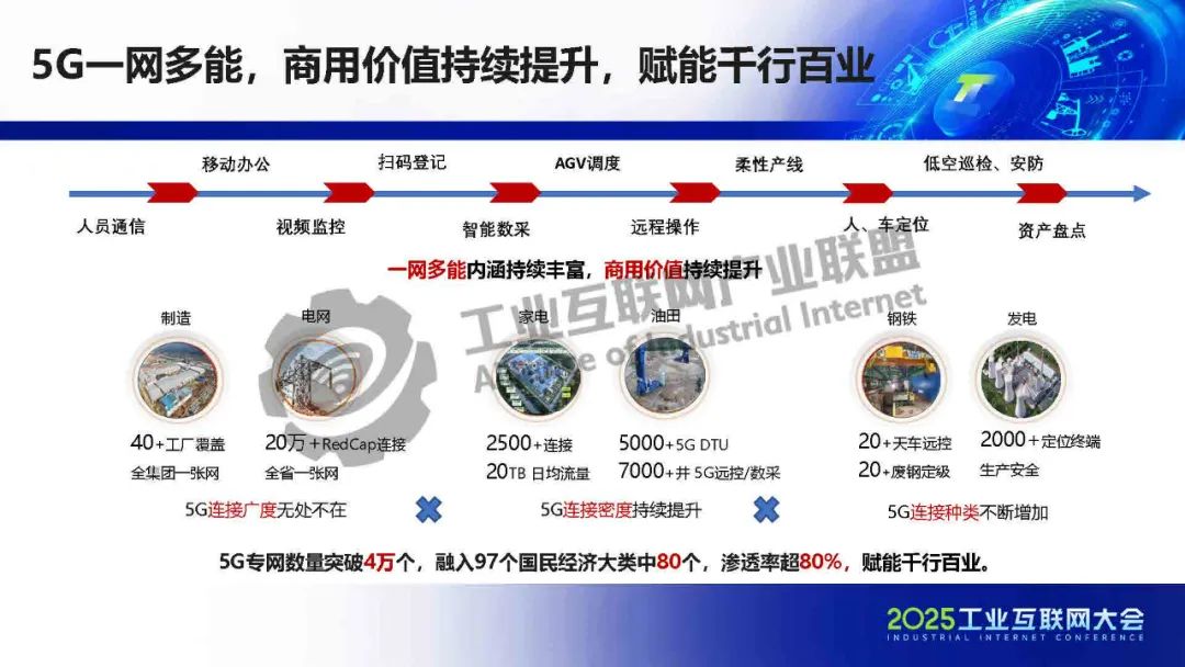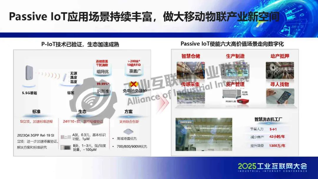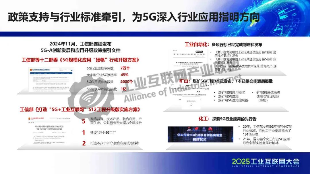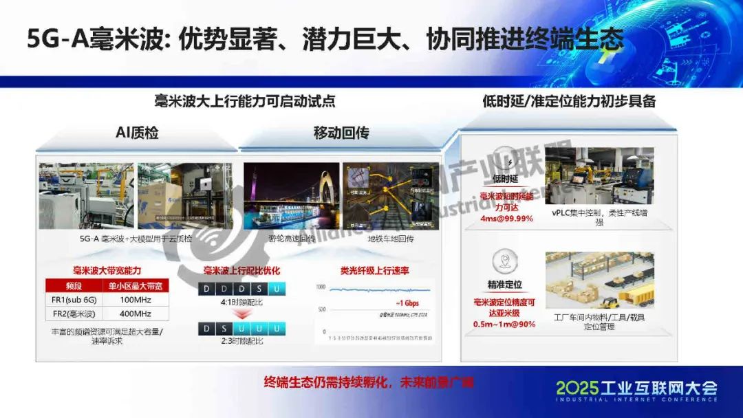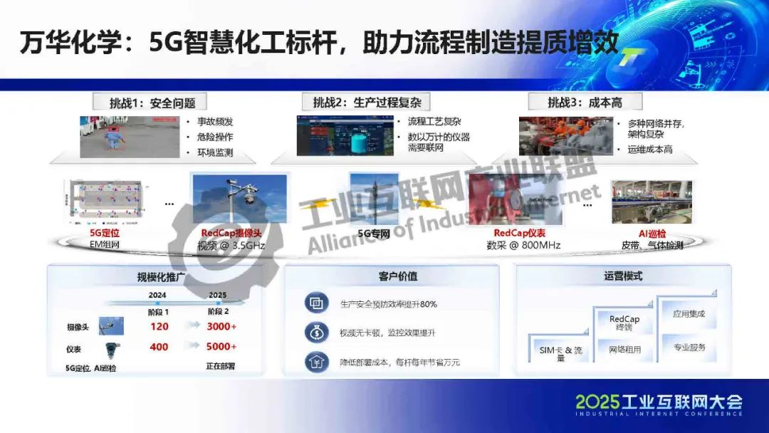 鄒向毅介紹,5G技術(shù)已具備確定性能力,如大上行(700Mbps)、穩(wěn)時延(8±4ms)、準(zhǔn)定位(1-3m),并通過廣域/局域?qū)>W(wǎng)架構(gòu)服務(wù)千行百業(yè)。5G行業(yè)模組和終端形態(tài)豐富,成本持續(xù)下降,加速了工業(yè)應(yīng)用落地。政策支持與行業(yè)標(biāo)準(zhǔn)(如化工、礦山領(lǐng)域)進(jìn)一步推動5G規(guī)模化應(yīng)用,目標(biāo)覆蓋7萬企業(yè)、1億終端連接。典型案例包括:平煤集團(tuán)利用5G實(shí)現(xiàn)遠(yuǎn)程采礦,效率提升50%;荊州美的通過全流程5G貫通,降低人工成本30%;勝利油田借助5G無盲區(qū)覆蓋,年省巡檢成本260萬元;萬華化學(xué)以5G專網(wǎng)提升生產(chǎn)安全80%。此外,5G-A新方案(毫米波、Passive IoT、通感一體)將進(jìn)一步釋放潛力,如毫米波實(shí)現(xiàn)亞米級定位,Passive IoT免電池覆蓋200米,通感一體助力低空安防。華為5G已賦能制造、電網(wǎng)等80個行業(yè)大類,專網(wǎng)超4萬個,持續(xù)推動工業(yè)數(shù)字化提質(zhì)增效。