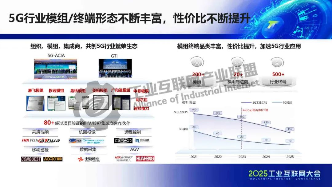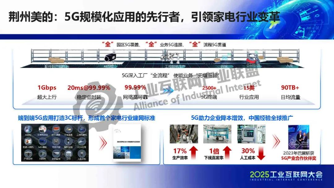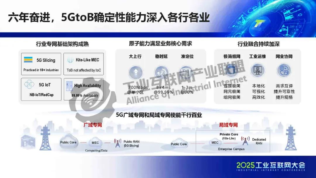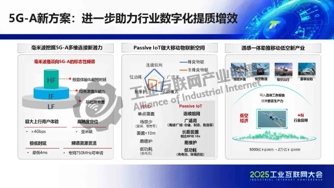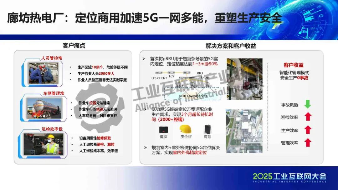 鄒向毅介紹,5G技術(shù)已具備確定性能力,如大上行(700Mbps)、穩(wěn)時延(8±4ms)、準(zhǔn)定位(1-3m),并通過廣域/局域?qū)>W(wǎng)架構(gòu)服務(wù)千行百業(yè)。5G行業(yè)模組和終端形態(tài)豐富,成本持續(xù)下降,加速了工業(yè)應(yīng)用落地。政策支持與行業(yè)標(biāo)準(zhǔn)(如化工、礦山領(lǐng)域)進(jìn)一步推動5G規(guī)模化應(yīng)用,目標(biāo)覆蓋7萬企業(yè)、1億終端連接。典型案例包括:平煤集團(tuán)利用5G實(shí)現(xiàn)遠(yuǎn)程采礦,效率提升50%;荊州美的通過全流程5G貫通,降低人工成本30%;勝利油田借助5G無盲區(qū)覆蓋,年省巡檢成本260萬元;萬華化學(xué)以5G專網(wǎng)提升生產(chǎn)安全80%。此外,5G-A新方案(毫米波、Passive IoT、通感一體)將進(jìn)一步釋放潛力,如毫米波實(shí)現(xiàn)亞米級定位,Passive IoT免電池覆蓋200米,通感一體助力低空安防。華為5G已賦能制造、電網(wǎng)等80個行業(yè)大類,專網(wǎng)超4萬個,持續(xù)推動工業(yè)數(shù)字化提質(zhì)增效。