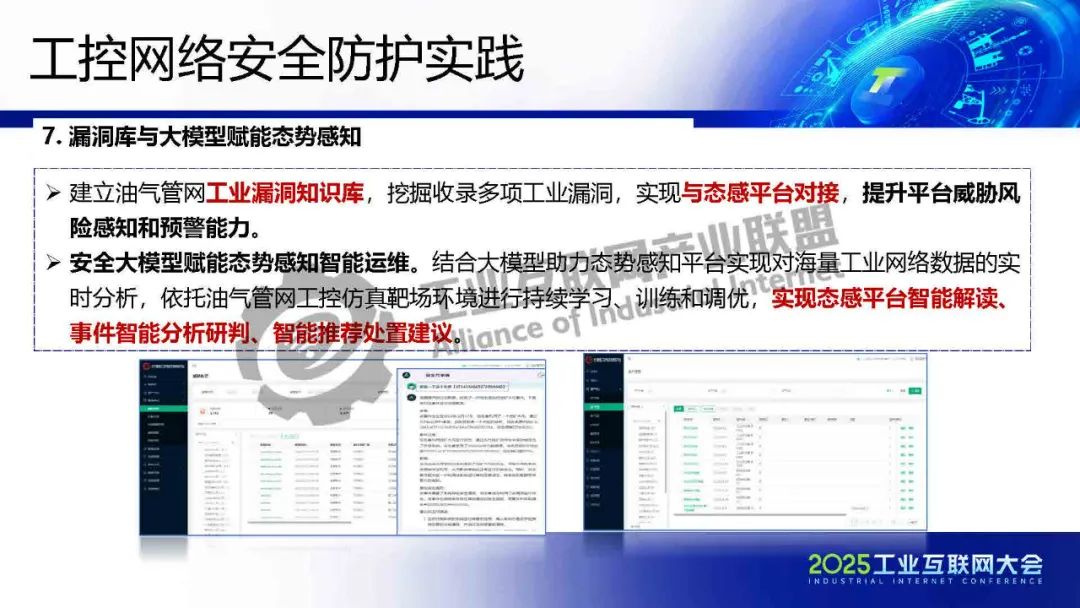 賈立東介紹,目前,國(guó)家管網(wǎng)所轄油氣管道近11萬(wàn)公里,已形成“三縱四橫、連通海外、覆蓋全國(guó)”的大型“廣域分布”油氣輸送網(wǎng)絡(luò),管道輸送的成品油、原油、天然氣在全國(guó)年消費(fèi)量占比達(dá)到 28%、35%和 60%,成為國(guó)民經(jīng)濟(jì)的“能源生命線”。工控網(wǎng)絡(luò)安全防護(hù)結(jié)合大模型助力態(tài)勢(shì)感知平臺(tái)實(shí)現(xiàn)對(duì)海量工業(yè)網(wǎng)絡(luò)數(shù)據(jù)的實(shí)時(shí)分析,依托油氣管網(wǎng)工控仿真靶場(chǎng)環(huán)境進(jìn)行持續(xù)學(xué)習(xí)、訓(xùn)練和調(diào)優(yōu),實(shí)現(xiàn)態(tài)感平臺(tái)智能解讀、事件智能分析研判、智能推薦處置建議。