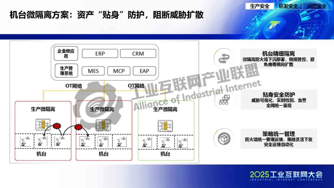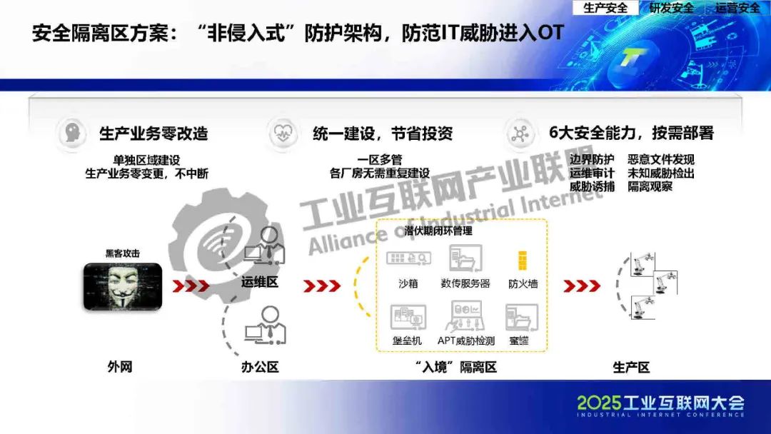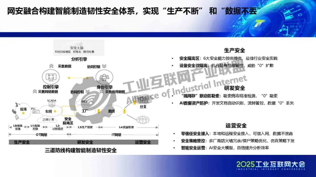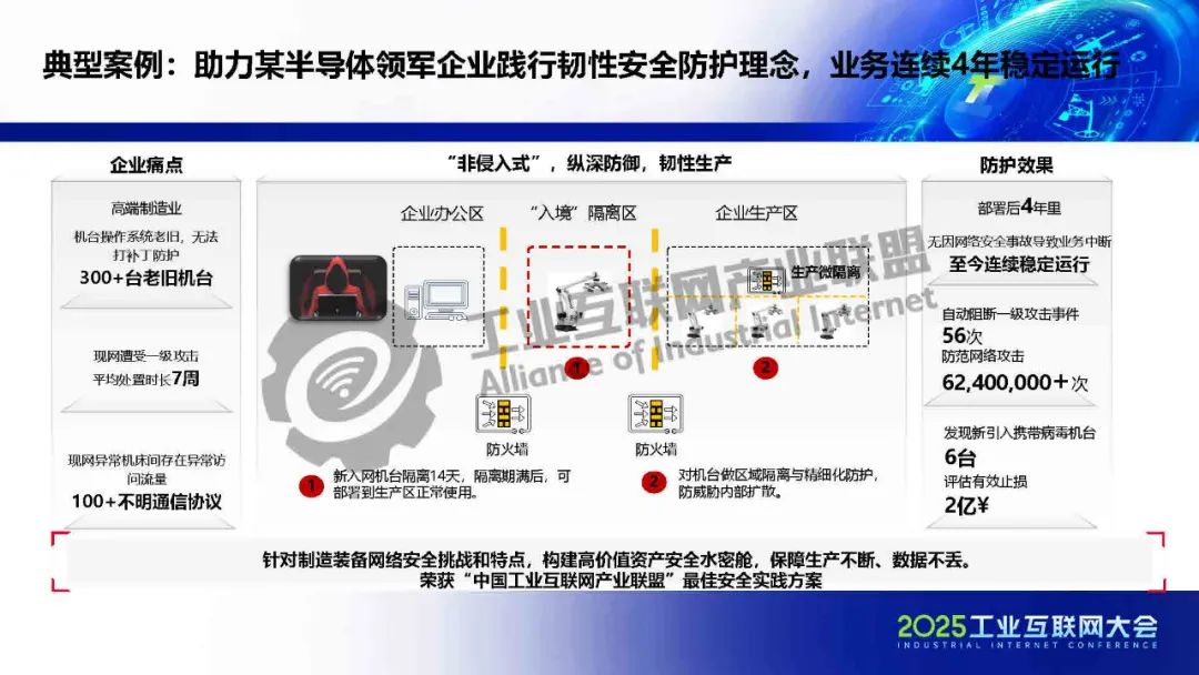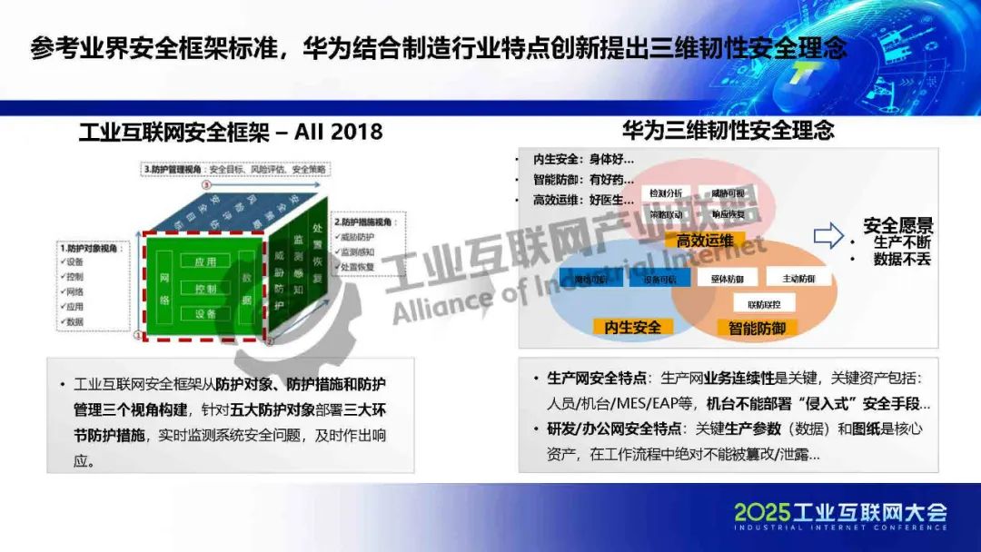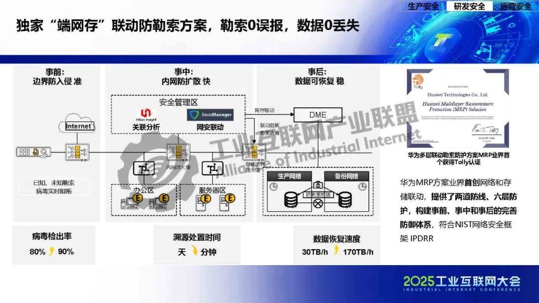 張光明介紹,參考業(yè)界安全框架標準,華為結(jié)合制造行業(yè)特點創(chuàng)新提出三維韌性安全理念。該理念通過內(nèi)生安全、智能防御和高效運維,結(jié)合檢測分析、威脅可視、策略聯(lián)動和響應(yīng)恢復(fù),采用全流程可信設(shè)計,關(guān)鍵器件100%國產(chǎn)化,達到非侵入式安全隔離區(qū)實現(xiàn)IT/OT隔離、機臺微隔離阻斷橫向威脅擴散、業(yè)界首創(chuàng)"端網(wǎng)存"聯(lián)動防勒索方案、零信任動態(tài)授權(quán)確保安全接入、AI大模型提升安全運營效率160倍等效果,已助力某半導(dǎo)體企業(yè)實現(xiàn)4年業(yè)務(wù)零中斷,累計防御攻擊超6240萬次。華為方案獲得Gartner等權(quán)威機構(gòu)認可,實現(xiàn)"生產(chǎn)不斷、數(shù)據(jù)不丟"的安全目標。