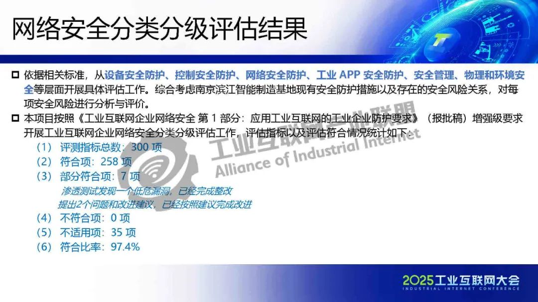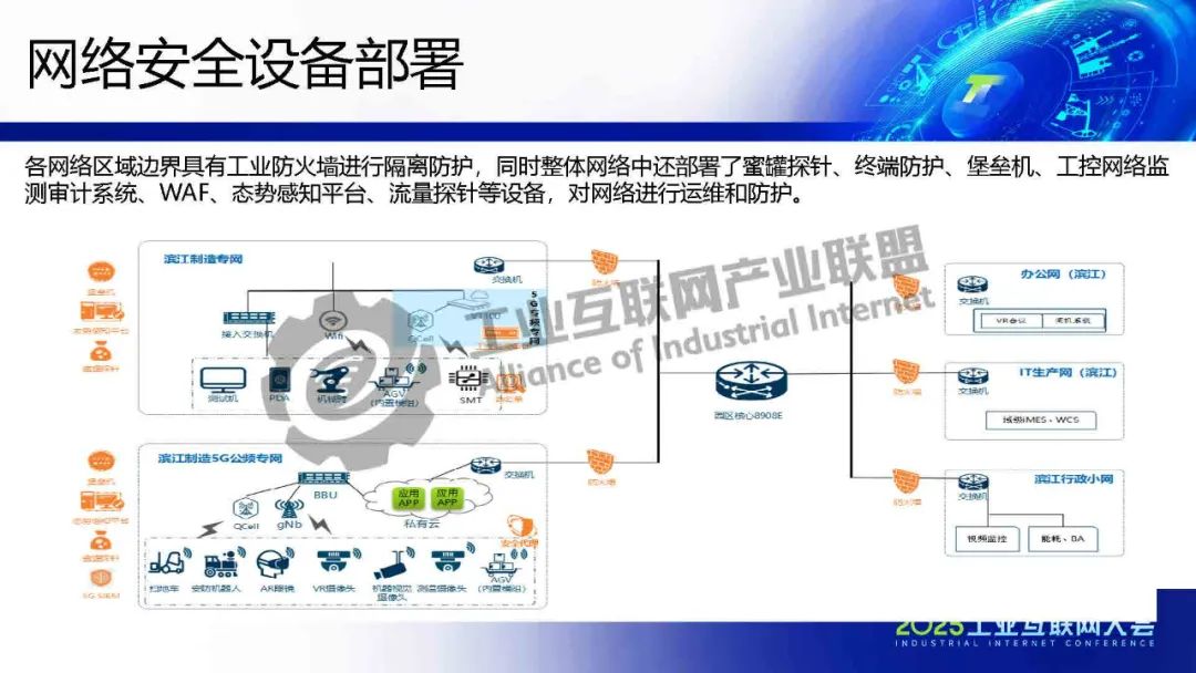 郝振武介紹,中興通訊南京濱江智能制造基地是首個信通院認證的五星5G工廠。基地整體網絡結構劃分為辦公網、IT 生產網、濱江行政小網、濱江制造專網、濱江制造5G公頻專網等,其中制造專網中具有5G專頻專網用于現場生產,非常具有典型意義。網絡遵循網絡安全等級保護的要求,按照“一個中心三重防護"設計,在5G公頻專網部署了防火墻、堡壘機、態勢感知、蜜罐等防護措施,在5G專頻專網部署了工控防火墻、工控網絡監測審計系統,保證了網絡的安全運行?;赝ㄟ^了工業網絡與數據安全中心的工業互聯網企業網絡安全分類分級增強級評估,極大的提升網絡防護水平和安全治理效果。