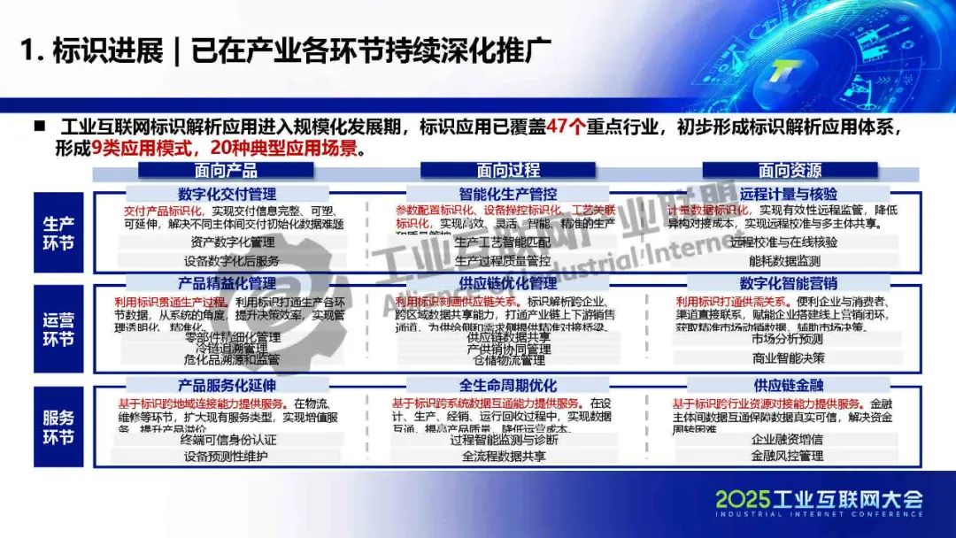 劉巍介紹,標(biāo)識(shí)解析體系已具規(guī)模,標(biāo)識(shí)工作向“由建到用”發(fā)展,應(yīng)用場(chǎng)景逐步落地,覆蓋政務(wù)管理、行業(yè)、公共服務(wù)等,標(biāo)識(shí)節(jié)點(diǎn)數(shù)據(jù)貫通、運(yùn)營(yíng)管理、應(yīng)用支撐能力逐步增強(qiáng)。工業(yè)互聯(lián)網(wǎng)標(biāo)識(shí)解析應(yīng)用進(jìn)入規(guī)模化發(fā)展期,標(biāo)識(shí)應(yīng)用已覆蓋47個(gè)重點(diǎn)行業(yè),初步形成標(biāo)識(shí)解析應(yīng)用體系,形成9類(lèi)應(yīng)用模式,20種典型應(yīng)用場(chǎng)景。