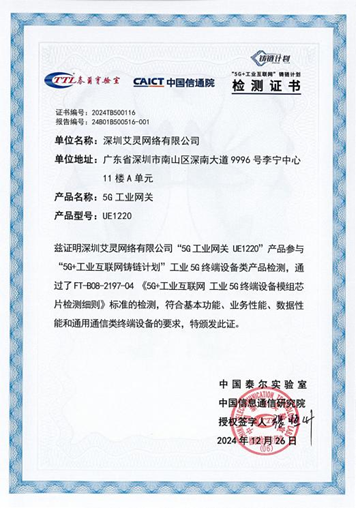 近日,深圳艾靈網絡有限公司自主研發的UE1220工業5G網關順利通過第一批“5G+工業互聯網”鑄鏈計劃產品測試,測試內容涵蓋5G NR基本功能、業務性能、數據性能和通信類終端功能等方面。