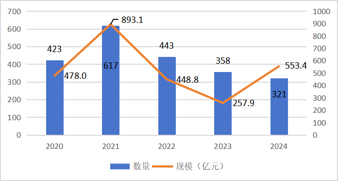 2020-2024年工業(yè)互聯(lián)網領域投融資事件數量與規(guī)模