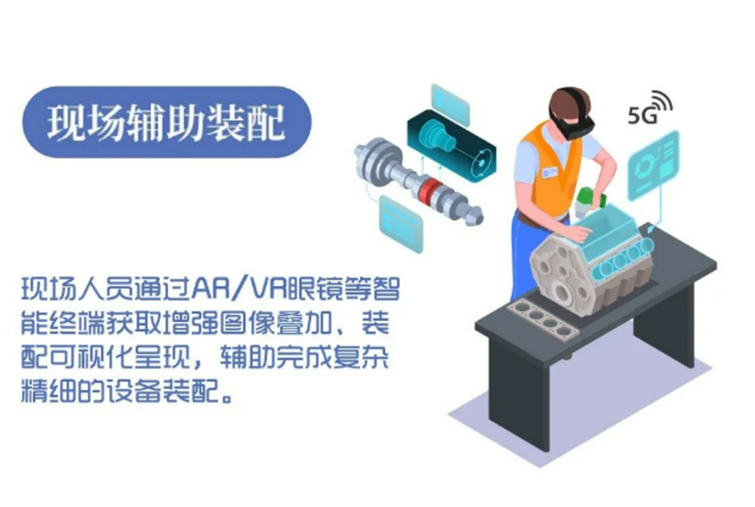 通過內(nèi)置 5G 模組或部署5G網(wǎng)關(guān)等設(shè)備,實現(xiàn) AR/VR 眼鏡、智能手機、PAD 等智能終端的5G網(wǎng)絡(luò)接入,采集現(xiàn)場圖像、視頻、聲音等數(shù)據(jù),通過5G網(wǎng)絡(luò)實時傳輸至現(xiàn)場輔助裝配系統(tǒng),系統(tǒng)對數(shù)據(jù)進行分析處理,生成生產(chǎn) 4 輔助信息,通過 5G 網(wǎng)絡(luò)下發(fā)至現(xiàn)場終端,實現(xiàn)操作步驟的增強圖像疊加、裝配環(huán)節(jié)的可視化呈現(xiàn),幫助現(xiàn)場人員進行復(fù)雜設(shè)備或精細化設(shè)備的裝配。另外,專家的指導(dǎo)信息、設(shè)備操作說明書、圖紙、文件等也可以通過5G網(wǎng)絡(luò)實時同步到現(xiàn)場終端,現(xiàn)場裝配人員簡單培訓(xùn)后即可上崗,有效提升現(xiàn)場操作人員的裝配水平,實現(xiàn)裝配過程智能化,提升裝配效率。