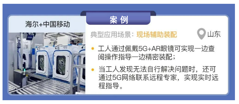 海爾與中國移動合作,在山東省青島市利用5G技術(shù)實現(xiàn)了精密工業(yè)裝備的現(xiàn)場輔助裝配場景的應(yīng)用。青島海爾家電工廠結(jié)合海爾卡奧斯工業(yè)互聯(lián)網(wǎng)平臺,打造基于5G+MEC 的互聯(lián)工廠,開展了基于AR 眼鏡的5G遠程輔助裝配,工人通過佩戴 AR 眼鏡采集關(guān)鍵工業(yè)裝備的現(xiàn)場視頻,同時從后臺系統(tǒng)調(diào)取產(chǎn)品安裝指導(dǎo)推送到AR眼鏡上,實現(xiàn)了一邊查閱操作指導(dǎo)一邊裝配的目的。當(dāng)工人發(fā)現(xiàn)無法自行 9 解決問題時,還可以通過 5G 網(wǎng)絡(luò)聯(lián)系遠程專家,實現(xiàn)實時遠程指導(dǎo)。另外,通過將算力部署在MEC 側(cè),降低了AR眼鏡算力要求與眼鏡重量,實現(xiàn)數(shù)據(jù)的本地計算,保障視頻數(shù)據(jù)不出園區(qū),一方面解決了以往Wi-Fi 連接產(chǎn)生的信號不穩(wěn)定、暈眩感和 AR 眼鏡偏重的困擾,另一方面也節(jié)省了維修時間和成本。