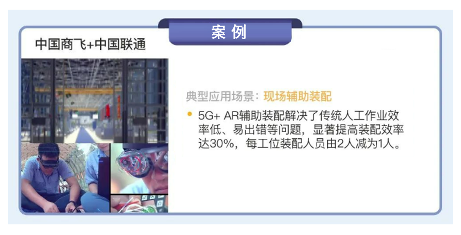 中國商飛與中國聯(lián)通合作,在上海浦東新區(qū)開展了“5G+工業(yè)互聯(lián)網(wǎng)賦能大飛機智能制造”項目建設(shè),搭建了 5 座宏基站和 150 余套室分小站,實現(xiàn)了現(xiàn)場輔助裝配場景的應(yīng)用。在現(xiàn)場輔助裝配方面,商飛在裝配車間中存在大量飛機線纜連接器裝配工作的工位,通過引入 5G+AR 輔助裝配系統(tǒng),工人利用AR虛擬信息實現(xiàn)虛實疊加,根據(jù)顯示的指導(dǎo)畫面完成裝配操作。通過 5G 高速率和低時延特性,讓工人準確、快速地對 12 線纜連接器進行查找和裝配,并保障數(shù)據(jù)的有效性,解決了傳統(tǒng)人工作業(yè)效率低、容易出錯等問題,顯著提高了裝配效率達 30%,每工位所需裝配人員由2 人減少為1 人。
