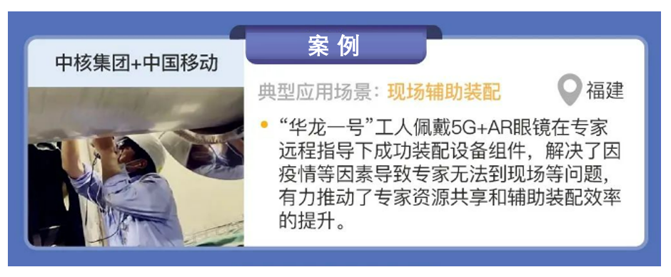 中核集團與中國移動合作,在福建省福清開展5G+核電項目建設(shè),實現(xiàn)了現(xiàn)場輔助裝配場景的應(yīng)用。在“華龍一號”六號機組的裝配建設(shè)現(xiàn)場,通過5G專網(wǎng)+AR等技術(shù),工人佩戴 AR 眼鏡在專家遠程指導(dǎo)下成功裝配設(shè)備組件,解決了因疫情等因素導(dǎo)致專家無法到現(xiàn)場等問題,有力推動了專家資源共享和輔助裝配效率的提升。