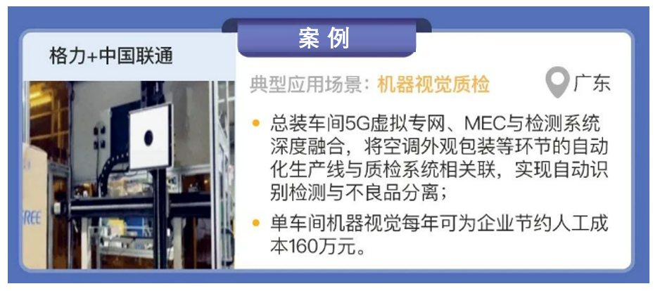 格力與中國聯通合作,在廣東省利用5G技術部署了機器視覺質檢場景的應用。在格力電器的總裝車間,聯通以一套獨立 MEC 為格力打造了工業虛擬專網,實現生產控制網與生產管理網融合,在模擬場景中基于樣本訓練建立數據模型,在需要自動檢測的工位上安裝5G高清攝像頭,與自動化生產線同頻聯調,在實際生產中利用5G網絡將待檢內容自動拍照,照片視頻流上傳至部署在MEC平臺的機器視覺質檢應用,運用圖形處理單元(GPU)大算力資源與數據模型做實時比對分析檢查,實現設備自動識別,檢測結果以毫秒級時延返回現場端,自動化生產線與質檢系統關聯做出不良品分離操作。5G 虛擬專網、MEC 平臺與檢測系統深度融合,為機器視覺質檢應用的數據傳輸和信息處理提供了強大保障。目前格力已在其總部總裝生產線的空調外觀包裝、壓縮機線序、空調自動電氣安全測試等環節中部署了5G機器視覺質檢應用,單車間機器視覺每年可為企業節約人工成本 160 萬元。