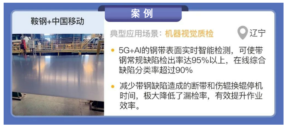 鞍鋼與中國移動合作,在遼寧省開展了“基于5G 的機器視覺帶鋼表面檢測平臺研發與應用”項目建設,實現了機器視覺質檢場景的應用。在機器視覺質檢方面,通過部署工業相機拍攝高清圖片、采集質檢數據,利用 5G 網絡將采集到的冷軋現場4K/8K等高清圖像數據回傳至操作室平臺,通過平臺的視覺AI 分析能力對圖像進行處理分析,完成帶鋼表面缺陷的實時檢測;同時,帶鋼軋制速度極高,通過帶鋼表面的反光斑馬條紋反饋帶鋼的平整度,用于帶鋼生產質量的實時檢測,為張力輥等調節提供依據。方案部署完成后,帶鋼常規缺陷檢出率達95%以上,在線綜合缺陷分類率超過 90%,提高成材率的同時減少了帶鋼缺陷造成的斷帶和傷輥換輥停機時間。