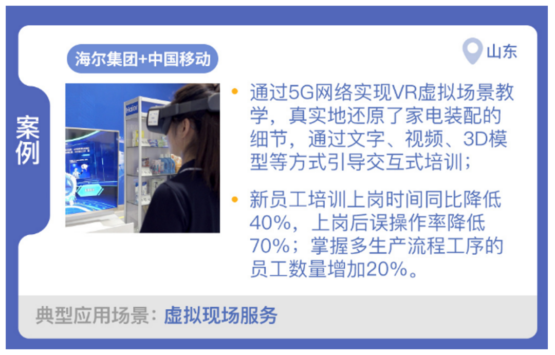 海爾集團與中國移動合作,開展了“5G全連接園區(qū)”項目建設(shè),實現(xiàn)了虛擬現(xiàn)場服務(wù)場景的應(yīng)用。基于算法上云架構(gòu),通過5G網(wǎng)絡(luò)實現(xiàn)VR內(nèi)容的云端存儲。根據(jù)使用需求下載對應(yīng)的VR內(nèi)容用于現(xiàn)場教學,真實地還原了家電裝配的細節(jié),通過文字、圖片、聲音、視頻、3D模型等方式引導交互式培訓,幫助培訓人員迅速掌握技術(shù)要領(lǐng),降低了部署成本,解決了新員工培訓上崗時間周期長的問題。自海爾工廠VR員工培訓平臺投入使用以來,新員工培訓上崗時間同比降低40%,上崗后誤操作率降低70%;老員工自主學習時長增加35%,掌握多生產(chǎn)流程工序的產(chǎn)線員工數(shù)量增加20%。