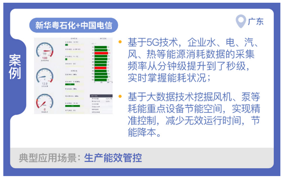 廣東新華粵石化股份有限公司與中國電信合作,開展了“能耗在線監測”項目建設,實現了生產能效管場景的應用。利用水表、電表、蒸汽測量儀、風速表、冷熱計量表等計量設備采集企業水、電、汽、風、熱等能源消耗數據,通過5G網絡傳輸至企業綜合能源管理平臺,并按時按需上傳到廣東省能耗在線監管平臺,采集頻率從分鐘級提升到了秒級,顯著提升了數據采集的效率。綜合能源管理平臺可實時監測電流、電壓、冷熱量計量等運行參數,通過用電趨勢分析、用電異常監測、用熱對比分析等方法,實時掌握能耗狀況。基于大數據分析技術挖掘風機、泵等耗能重點設備節能空間,進行節能改造,實現精準控制,減少無效運行時間,提高了生產能耗信息化管理水平,降低了生產成本。