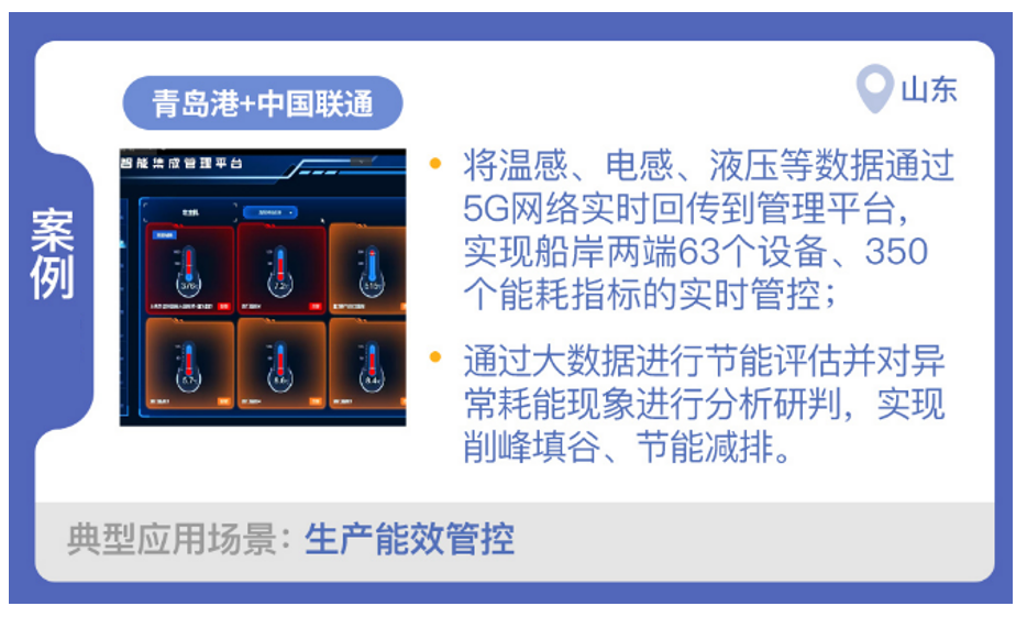 山東港口青島港集團有限公司與中國聯通合作,開展了“青島港5G智慧港口”項目建設,實現了生產能效管場景的應用。通過5G網絡,將溫感、電感、液壓、煙感等傳感器采集的數據實時回傳到智能集成管理平臺,實現船岸兩端63個設備、350個能耗指標的實時管控。通過大數據分析對船舶動力系統進行節能評估,動態調整船舶的經濟航速,實現削峰填谷、節能減排。通過自動化采集設備運行數據,提升了危險環境下的安全生產管理能力,提高安全生產預測效率和管理水平。針對異常耗能現象進行分析判,為設備的檢修維護提供決策支持。每年節省拖輪運維費用100萬元,節省人工檢測成本40萬元,檢測效率提升30%。
