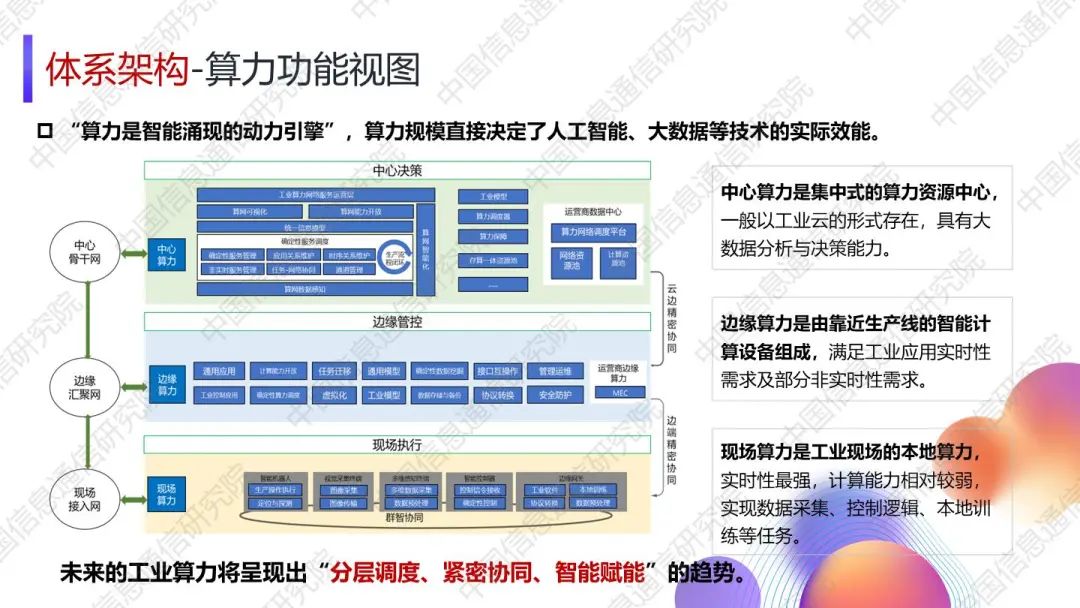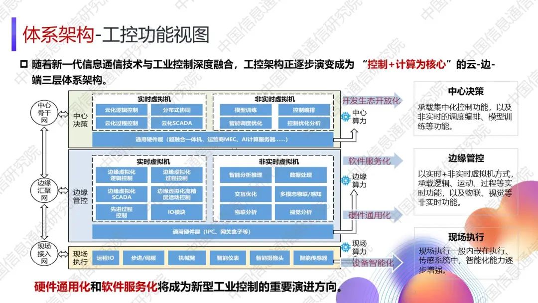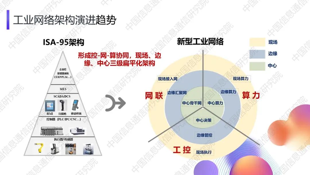 湯立波進(jìn)一步從工控、網(wǎng)聯(lián)、算力三大功能視角對(duì)新型工業(yè)網(wǎng)聯(lián)架構(gòu)進(jìn)行了詳細(xì)闡釋。對(duì)于未來發(fā)展趨勢(shì),湯立波表示,網(wǎng)聯(lián)三域?qū)⒊尸F(xiàn)出現(xiàn)場(chǎng)域異構(gòu)網(wǎng)絡(luò)融合、邊緣域高質(zhì)量承載網(wǎng)絡(luò)組合、中心域云化網(wǎng)絡(luò)協(xié)同的發(fā)展趨勢(shì),新型工業(yè)控制中硬件通用化和軟件服務(wù)化將成為重要演進(jìn)方向,工業(yè)算力將呈現(xiàn)出“分層調(diào)度、緊密協(xié)同、智能賦能”的趨勢(shì)。