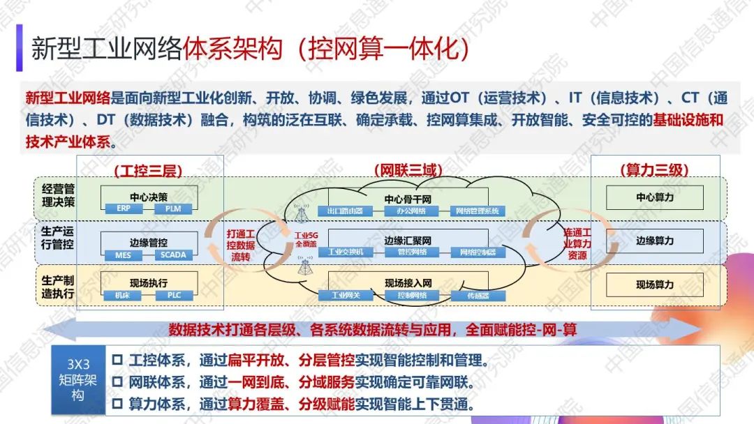 湯立波指出,新型工業(yè)網(wǎng)絡(luò)面向技術(shù)創(chuàng)新推動(dòng)、應(yīng)用需求牽引、生態(tài)重構(gòu)加速的時(shí)代需求,突出了“泛在互聯(lián)、確定承載、控網(wǎng)算集成、開放智能、安全可控”的新型工業(yè)網(wǎng)絡(luò)五大創(chuàng)新特征。湯立波強(qiáng)調(diào),新型工業(yè)網(wǎng)絡(luò)采用“3X3”矩陣架構(gòu):從能力上,網(wǎng)聯(lián)和算力能力從控制體系分離,形成“控-網(wǎng)-算”三要素協(xié)同的新架構(gòu);從層級(jí)上,將以端-邊-云為主體形成更為扁平化的三層級(jí)互聯(lián),即工控三層、網(wǎng)聯(lián)三域、算力三級(jí)。湯立波表示,工控三層包括現(xiàn)場(chǎng)執(zhí)行、邊緣管控和中心決策,通過扁平開放、分層管控實(shí)現(xiàn)智能控制和管理。網(wǎng)聯(lián)三域包括現(xiàn)場(chǎng)接入網(wǎng)、邊緣匯聚網(wǎng)和中心骨干網(wǎng),通過一網(wǎng)到底、分域服務(wù)實(shí)現(xiàn)確定可靠網(wǎng)聯(lián)。算力三級(jí)包括現(xiàn)場(chǎng)算力、邊緣算力和中心算力,通過算力覆蓋、分級(jí)賦能實(shí)現(xiàn)智能上下貫通。