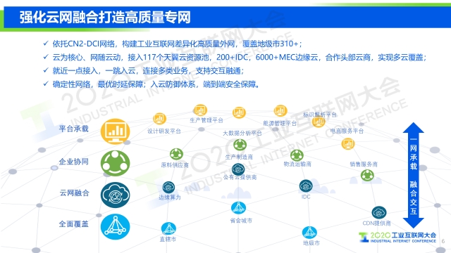 “業(yè)界普遍認(rèn)為,新基建,需要三大基礎(chǔ)設(shè)施,即,“5G+ 工業(yè)互聯(lián)網(wǎng)”的網(wǎng)絡(luò)設(shè)施、“人工智能+云計(jì)算”的新技術(shù)設(shè)施、“大數(shù)據(jù)技術(shù)+數(shù)據(jù)中心”的算力設(shè)施。中國(guó)電信將以云網(wǎng)融合為基,發(fā)揮自身優(yōu)勢(shì),不斷完善上述三大基礎(chǔ)設(shè)施建設(shè),借助5G等多連接技術(shù)、隨選的混合多云、云間高速網(wǎng)絡(luò)等形成5G+NBIOT+MEC+ABCD+工業(yè)PON+CN2的云網(wǎng)基礎(chǔ)設(shè)施底座,為工業(yè)互聯(lián)網(wǎng)提供綜合的、定制化的云網(wǎng)融合服務(wù)。同時(shí),中國(guó)電信將持續(xù)聚合國(guó)內(nèi)外工業(yè)互聯(lián)網(wǎng)平臺(tái)和應(yīng)用,與各界開(kāi)展合作。”