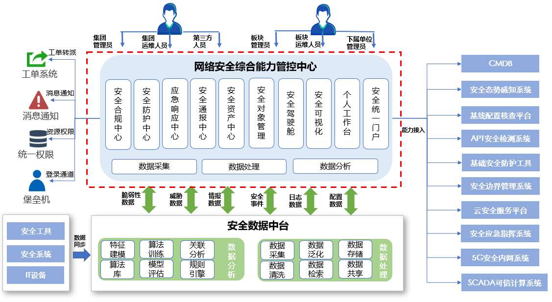 安全綜合能力管控平臺(tái)采用集團(tuán)集中部署,用戶分權(quán)分域模式建設(shè),支持微服務(wù)架構(gòu),通過集團(tuán)側(cè)安全工具的集中納管、安全能力的分類調(diào)用,以IPDRR模型為指引構(gòu)建安全能力中心,為浙能集團(tuán)及下屬單位安全運(yùn)營(yíng)人員提供安全服務(wù)。建設(shè)安全合規(guī)中心、安全監(jiān)測(cè)中心、安全防護(hù)中心、應(yīng)急響應(yīng)中心,依托浙能集團(tuán)數(shù)據(jù)中臺(tái)安全數(shù)據(jù)實(shí)現(xiàn)安全駕駛艙,在滿足安全監(jiān)管要求的同時(shí),具備網(wǎng)絡(luò)安全中臺(tái)演進(jìn)能力,為浙能集團(tuán)安全建設(shè)降本增效,解決浙能集團(tuán)安全設(shè)備管理建設(shè),安全運(yùn)營(yíng)缺乏協(xié)同等問題。