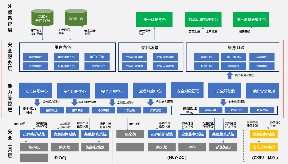 本期方案總體架構(gòu)分為四層,自下而上分別為安全工具層、能力管控層、安全服務(wù)層、外部系統(tǒng)層
