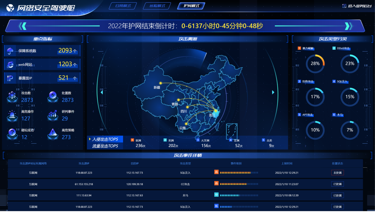 重保/護(hù)網(wǎng):在提供重保模式安全駕駛艙,可針對(duì)重保護(hù)網(wǎng)期間產(chǎn)生的安全事件進(jìn)行動(dòng)態(tài)呈現(xiàn),展示安全風(fēng)險(xiǎn)變化情況;提供應(yīng)急處置入口,針對(duì)護(hù)網(wǎng)期間需要進(jìn)行封堵的大批量IP地址進(jìn)行極速封堵操作,快速完成攻擊阻斷。