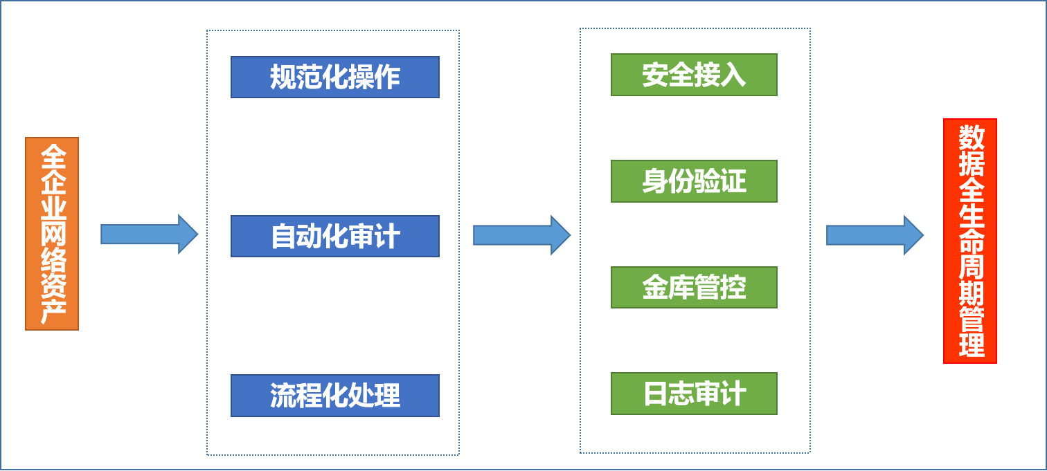 面向全企業網絡資產,圍繞“規范化操作、自動化審計、流程化處理”目標,開展精細化安全管理。以網絡安全管控平臺為抓手,實現安全接入、身份驗證、金庫管控、日志審計等管控能力,落實數據全生命周期管理。