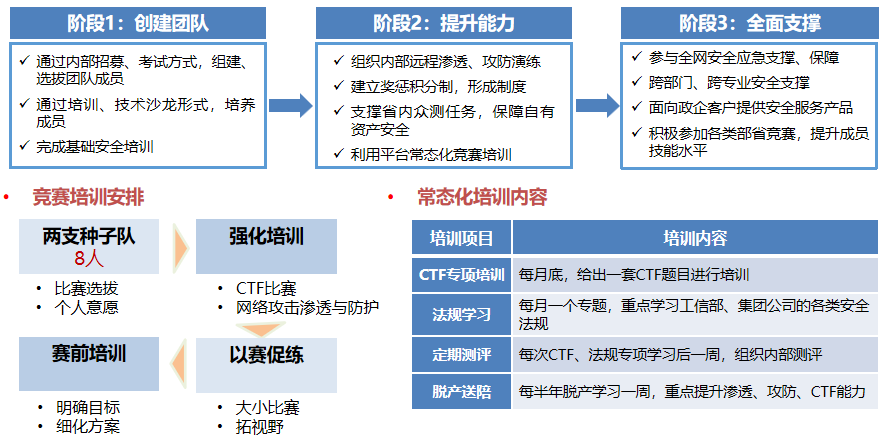集約化安全運營中心需要一支知守善攻的安全保障團隊。中國移動通信集團安徽有限公司認真規劃安全保障團隊的建設計劃,通過創建團隊、提升能力、全面支撐三個階段,穩步提升人員的綜合實力,并成立專門面向競賽的種子隊,針對性的培養行業頂尖的網絡安全人才,打造一支高水平安全攻防技術隊伍,積極參加企業內外專項行動及重大活動的網絡安全保障工作,覆蓋全公司的網絡安全各領域。