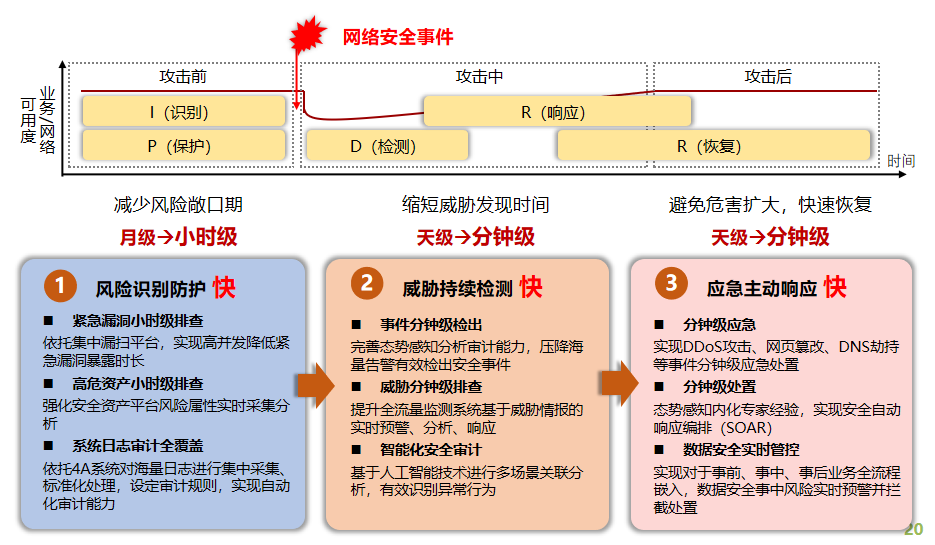 在面對網絡攻擊時,積極應對“侵”、“擾”、“竊”,深化IPDRR動態防護理念在現網攻防實戰中落地,突出強化保障中響應速度快的能力,提升網絡和數據安全端到端安全防護水平。