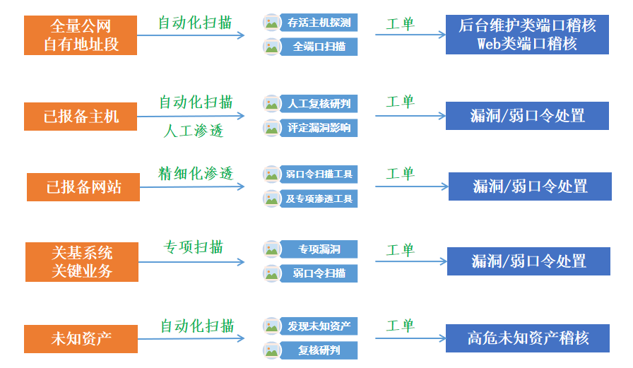 采用自動化掃描、人工滲透相結合方式,開展暴露面資產的發現、風險的檢測,實現多種掃描器交叉掃描、不同人員交叉滲透,依托網絡安全運維平臺,派發預警工單、跟蹤閉環。