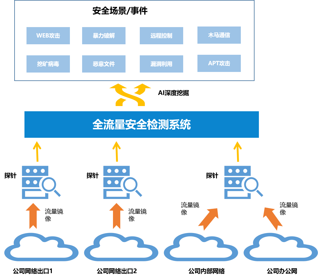 提升集約化安全運營中心對新業務的保障能力,在企業重要數據出口處部署全流量安全檢測系統,開展安全風險深度挖掘。對網絡鏈路全流量采集存儲、全數據分析,引入AI檢測引擎,基于規則+行為分析,為識別發現漏洞利用、高級木馬通訊、APT攻擊、數據竊密等提供更有效的監測手段。