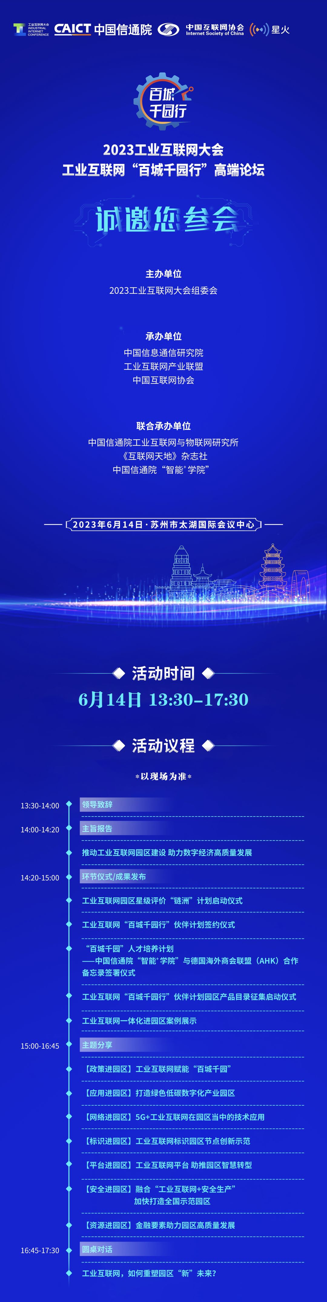 工業(yè)互聯(lián)網(wǎng)“百城千園行”高端論壇將于6月14日下午13:30在蘇州市太湖國際會議中心舉辦。論壇以“工賦園區(qū)·數(shù)智未來”,為主題通過主旨報告、環(huán)節(jié)儀式、成果發(fā)布、主題分享、圓桌對話等形式,賦能企業(yè)數(shù)字化轉型升級,推動工業(yè)互聯(lián)網(wǎng)高質量發(fā)展。會上,將舉行多項重磅儀式活動。