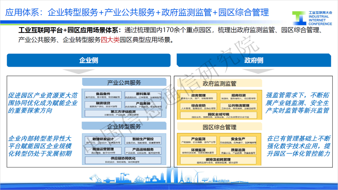 6月15日,2023工業互聯網大會在蘇州舉行,在“工業互聯網平臺創新發展”論壇上,中國信通院兩化所工互創新部楊昊亭發布了《“工業互聯網平臺+園區”典型場景》(以下簡稱“典型場景”)并進行了解讀。園區作為產業發展的主陣地,是推動我國經濟發展的重要引擎。“典型場景”圍繞園區高質量發展需求,提出了產業公共服務、企業轉型服務、政府監測監管、園區綜合管理四類應用場景,旨在為提升園區治理能力與加速產業轉型升級提供可借鑒的經驗和模式。