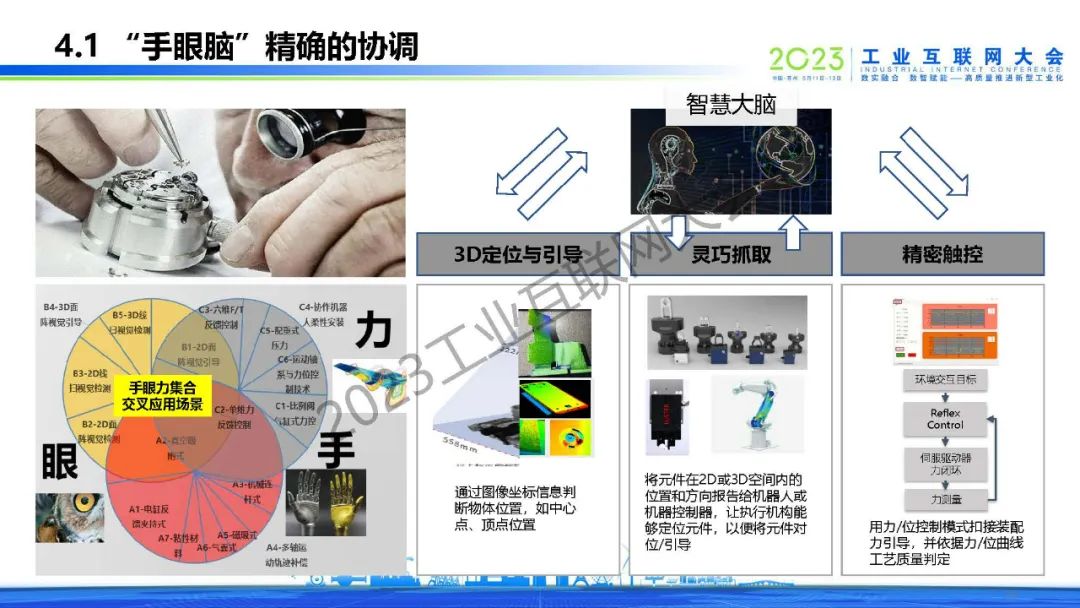 林杰分享智能制造產(chǎn)業(yè)趨勢和特征,指出了傳統(tǒng)制造型企業(yè)“智改數(shù)轉(zhuǎn)”的痛點,提出要為制造配上“慧眼”。他表示人工智能的飛速發(fā)展,為工業(yè)發(fā)展插上翅膀,通過“手眼腦”精確的協(xié)調(diào)和執(zhí)行來解決問題。