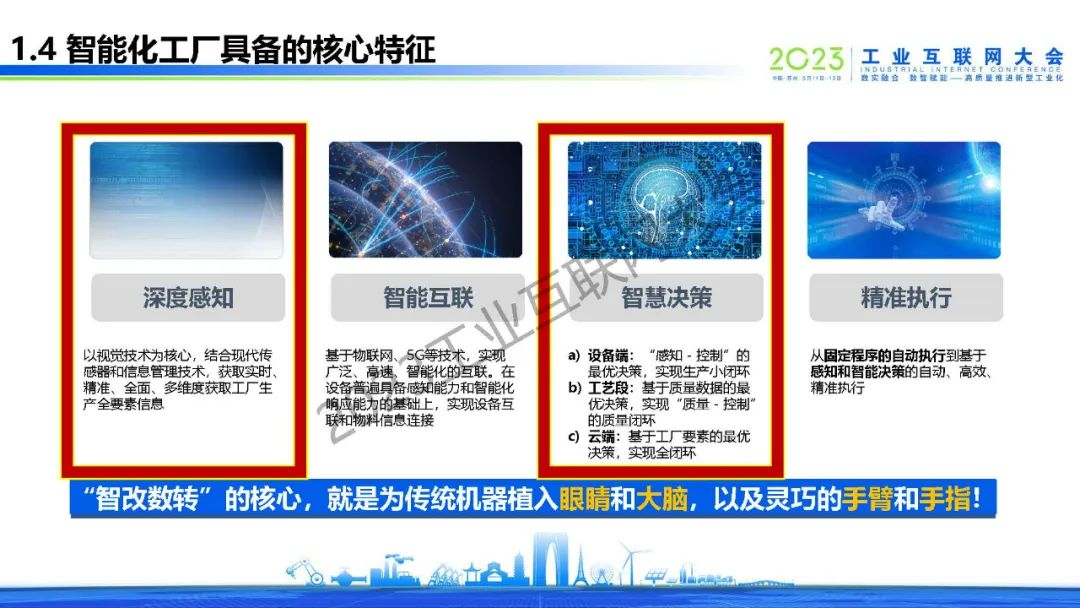 未來智能化工廠具備以下四個特征:深度感知,智能互聯(lián),智慧決策和精準執(zhí)行。“智改數(shù)轉(zhuǎn)”的核心,就是為傳統(tǒng)機器植入眼睛和大腦,以及靈巧的手臂和手指!